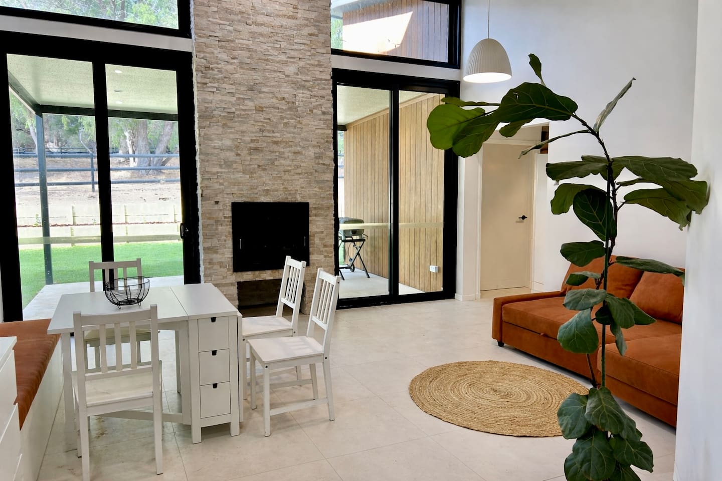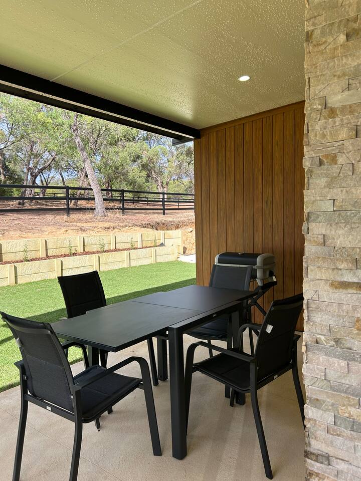 Guests have access to the home and the front portion of the property, up to the black fencing. As this is a rural acreage, access to outdoor areas is at your own risk. Please be mindful of natural country hazards such as uneven ground, rocks, rabbit holes, and the possibility of snakes. To help us establish the landscaping, we kindly ask that guests do not walk on the freshly sown grass in front of the stables. We appreciate your care and understanding while we continue to develop and improve the property.